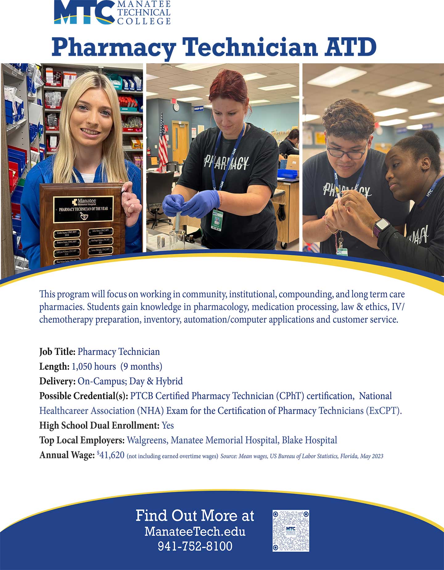 Program graduates are prepared to earn the PTCB Certified Pharmacy Technician (CPhT) certification and the National Healthcareer Association (NHA) Exam for the Certification of Pharmacy Technicians (ExCPT). Certified in Basic Life Support CPR AED. Completing students will earn the Pharmacy Technician Registration and Certification to Administer Immunizations from the Florida Board of Pharmacy.